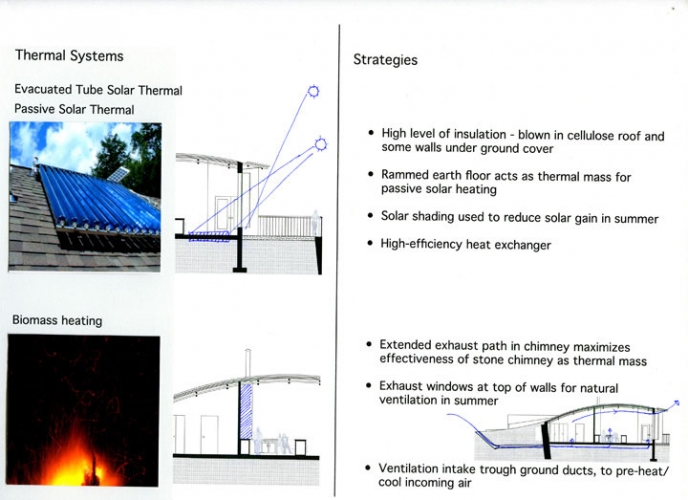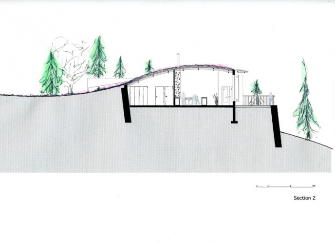 This design was based on the idea that the size of the community should be such that it can be sustained by the immediately surrounding land. To this end, the community is comprised of a series of pockets along the existing road that are small enough to be supported by the land, but large enough to make common infrastructure possible. The idea is to start with five to ten homes in each pocket, which are used as an example for future construction. These groupings can then grow as much as the resources permit.